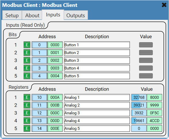 This LITE version of the plugin offers the base functionality of reading hardware inputs and writing hardware outputs with a limit of 16 inputs and 16 outputs. Both Input and Output Bits are represented as toggle buttons for easy control pin wiring. Registers are represented as integer fields with possible values from 0 to 65,535, and as hexadecimal string fields with values from 0x0000 to 0xFFFF.